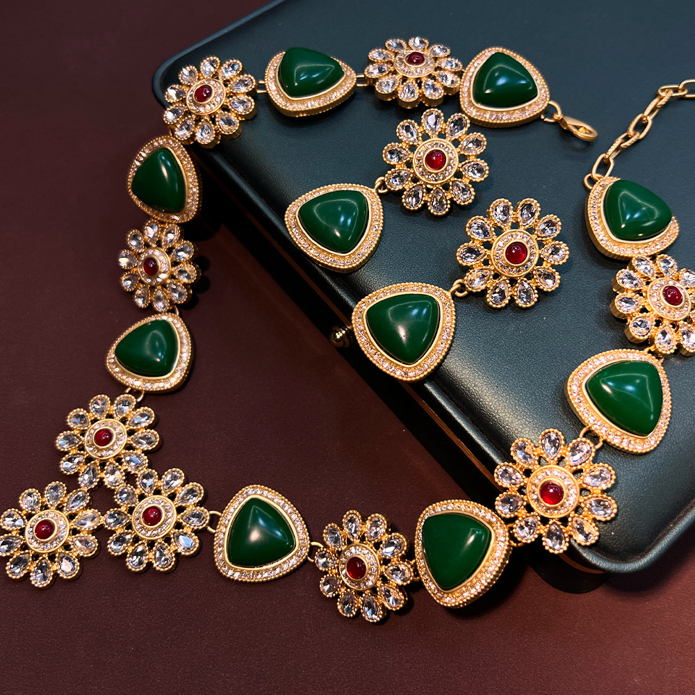 Antique vintage Jewelry suit Heavy Industry Green Flowers European and American Exaggerated Gold Plated S925 Necklace Earrings Batch