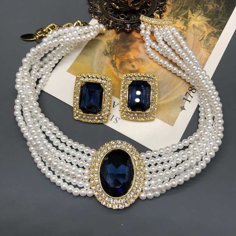 Classic Hepburn Style Multi-Layer Glazed Pearl Neck Chain Sapphire Gold Plated Clavicle Chain Silver Needle Ear Stud Ear Clip suit