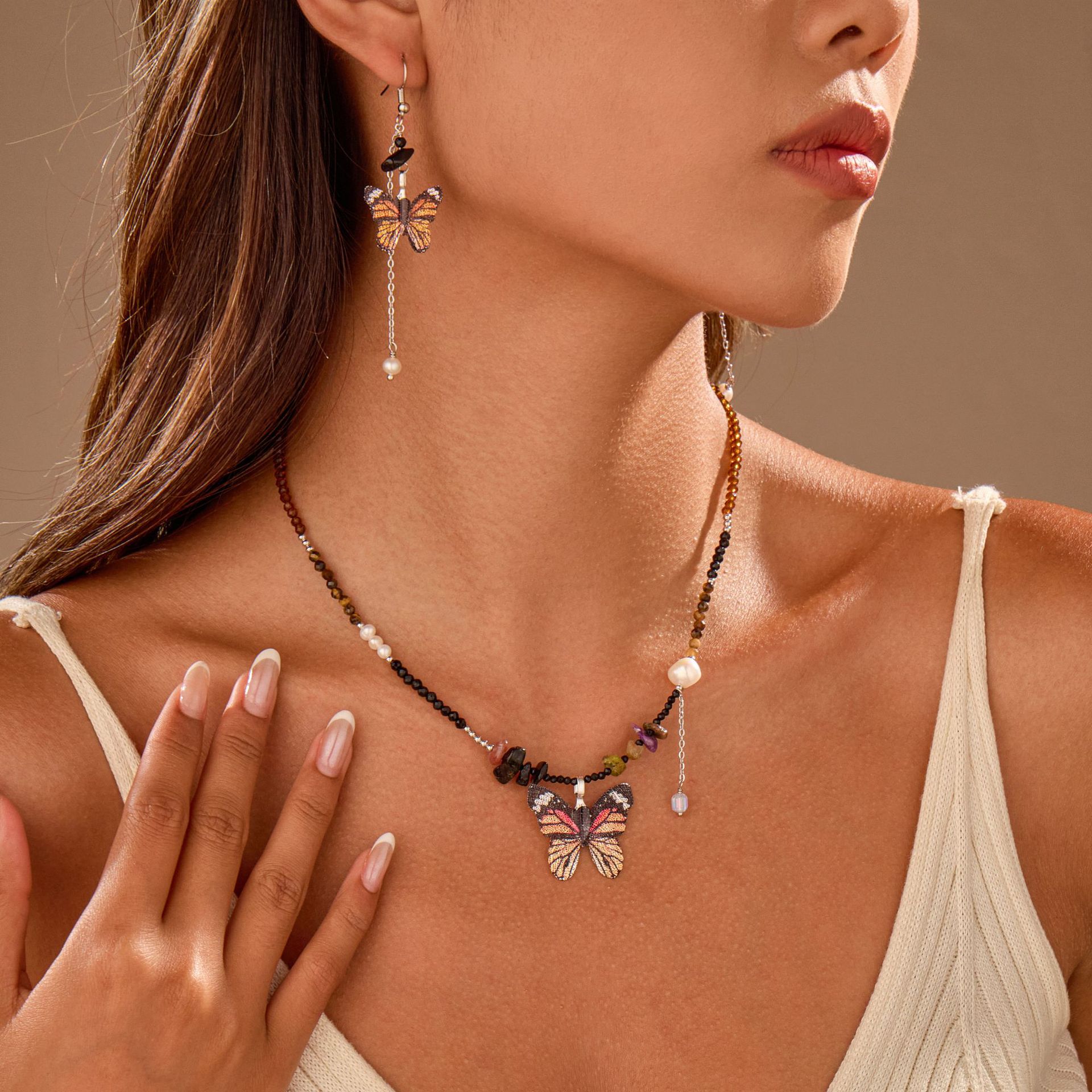 Cultural and Creative Entities Specialize in Butterfly Specimen Gold-Plated Necklaces and Earrings Sets, Coffee-Colored Series of Jewelry for Women, Simple and Light Luxury Style