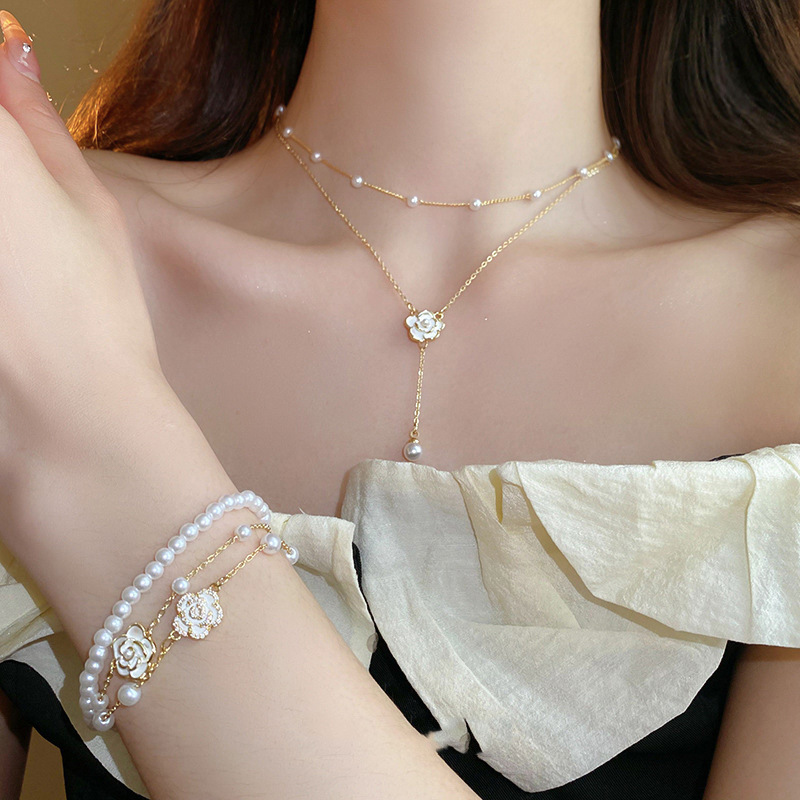 Real Gold Electroplated Zircon Pearl Oil Dropping Camellia Necklace Bracelet French Style Light Luxury Elegant Sweet suit Women's Jewelry