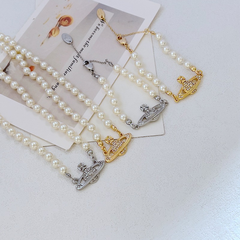 Fashion Light Luxury Commuter Niche Exquisite Saturn Pearl Copper Plated Gold Inlaid with Rhinestone Elegant Bracelet Necklace Set