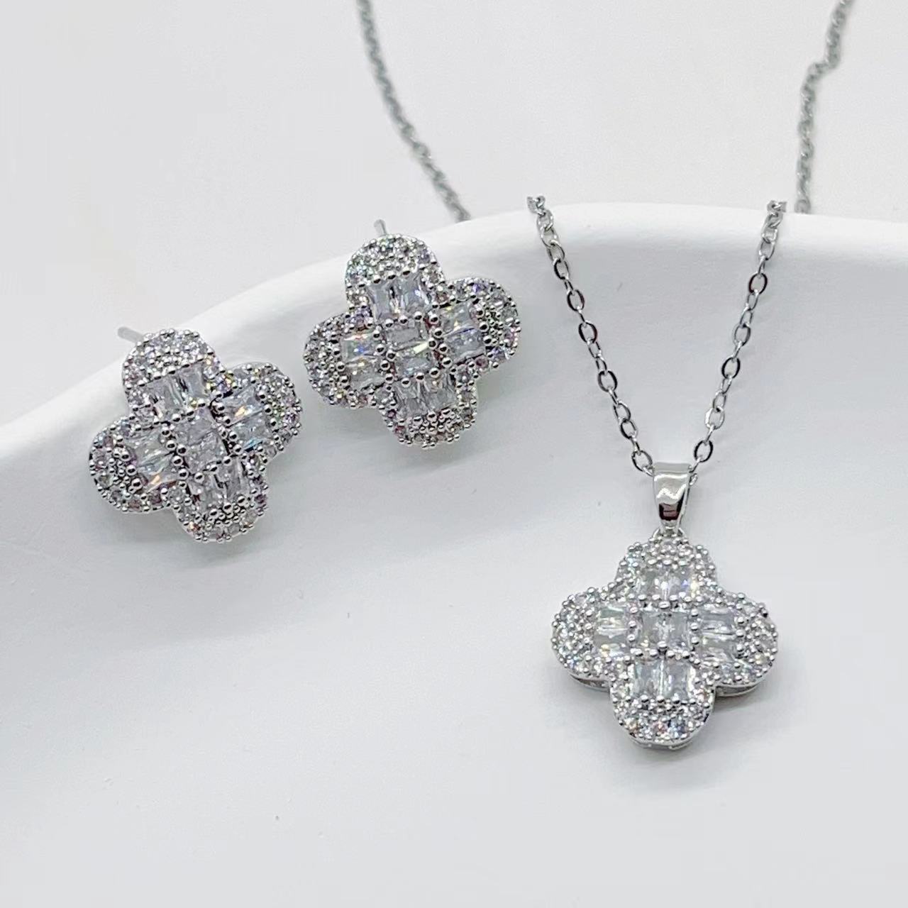 European and American Cross-Border Micro-Encrusted Zirconium Four-Leaf Clover Necklace and Earrings Two-Piece Set, Copper-Plated Real Gold, Accessible Luxury and Versatile