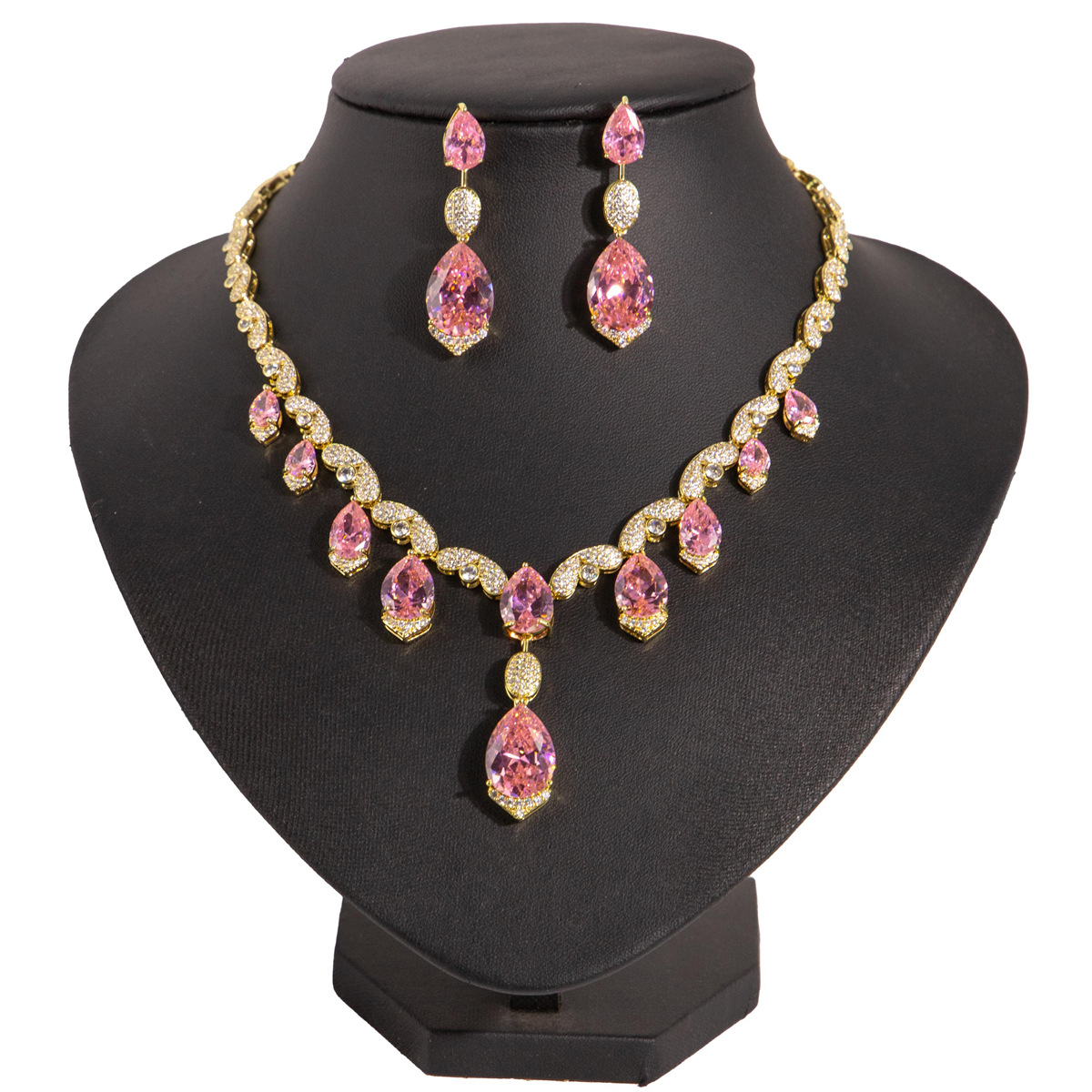 Cross-border Hot Diamond Drops Luxury Pink suit Necklace Earrings Bridal Dress Accessories Plated 18K Gold