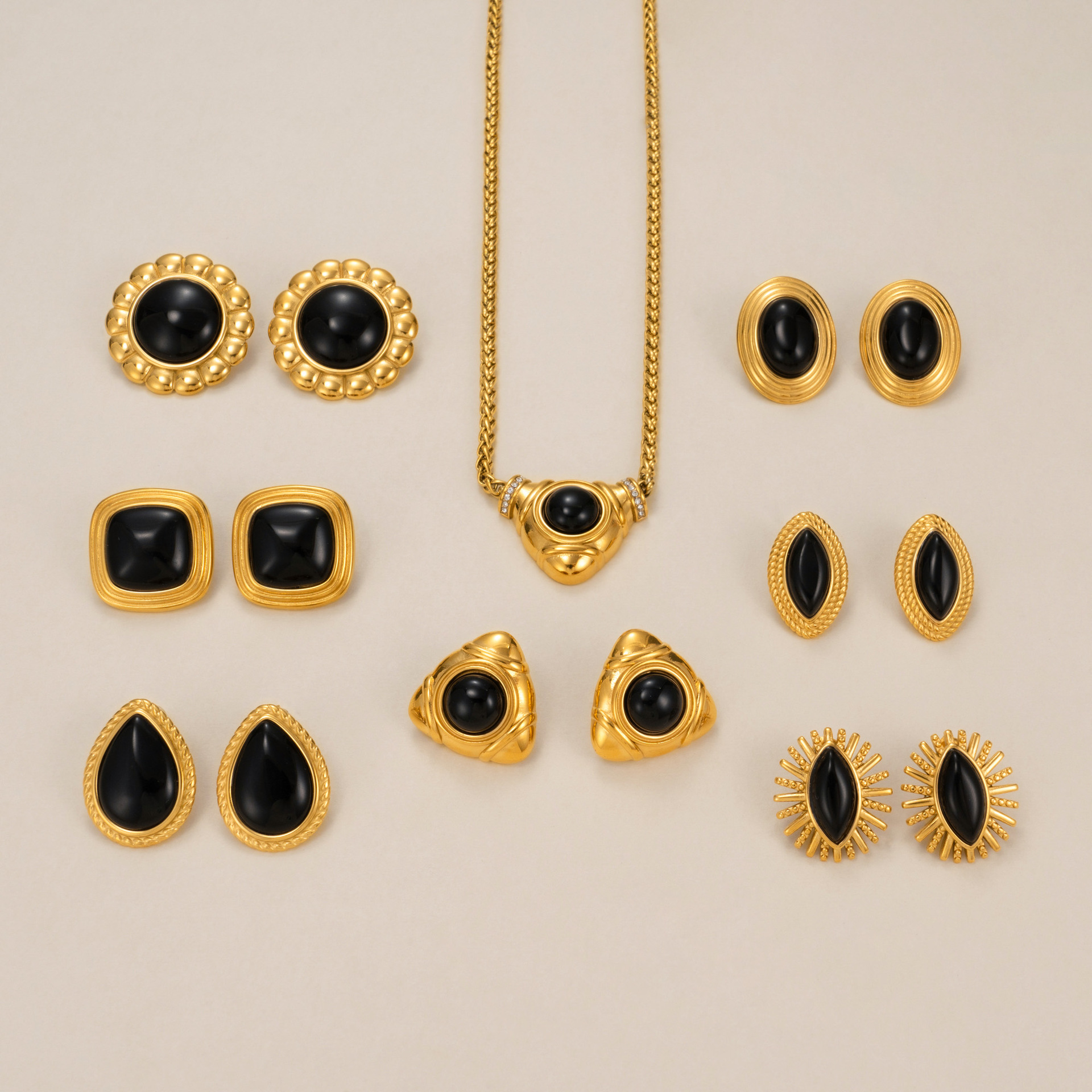 In-Stock European and American 18K Real Gold-Plated Titanium Steel Earrings, Light Luxury Black Gemstone Earrings and Necklace Set