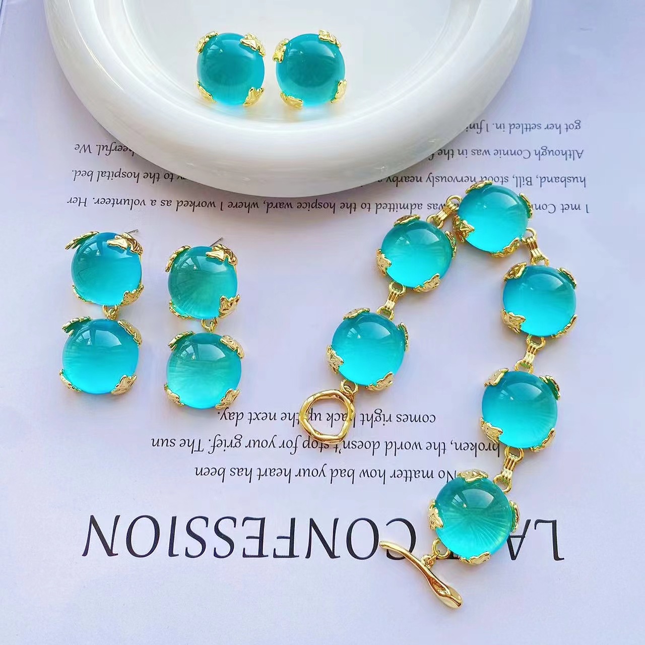 Medieval Vintage Western Retro Glass Inlaid Set Plated with Real Gold Heavy Industry Haze Blue Bracelet Earrings Customization
