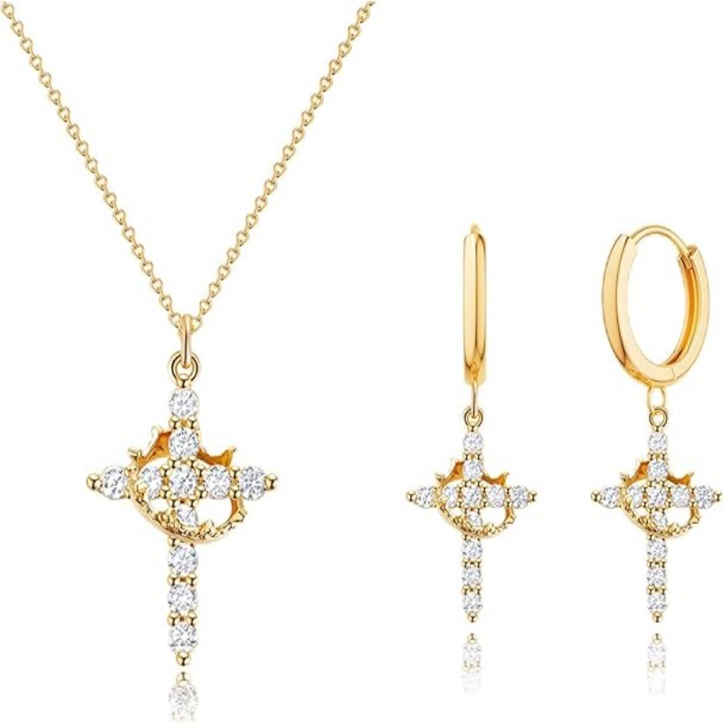 Women's Gold Cross Necklace and Earring Set 14K Gold Plated Crown Cross Pendant Necklace Set