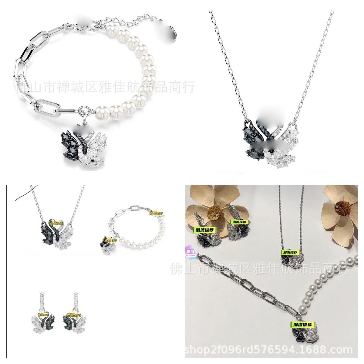 Shijia Cross-Border Hug Goose Pendant Necklace Pearl Splicing Twin Swan Bracelet Black and White Double Goose Earrings Set Gift