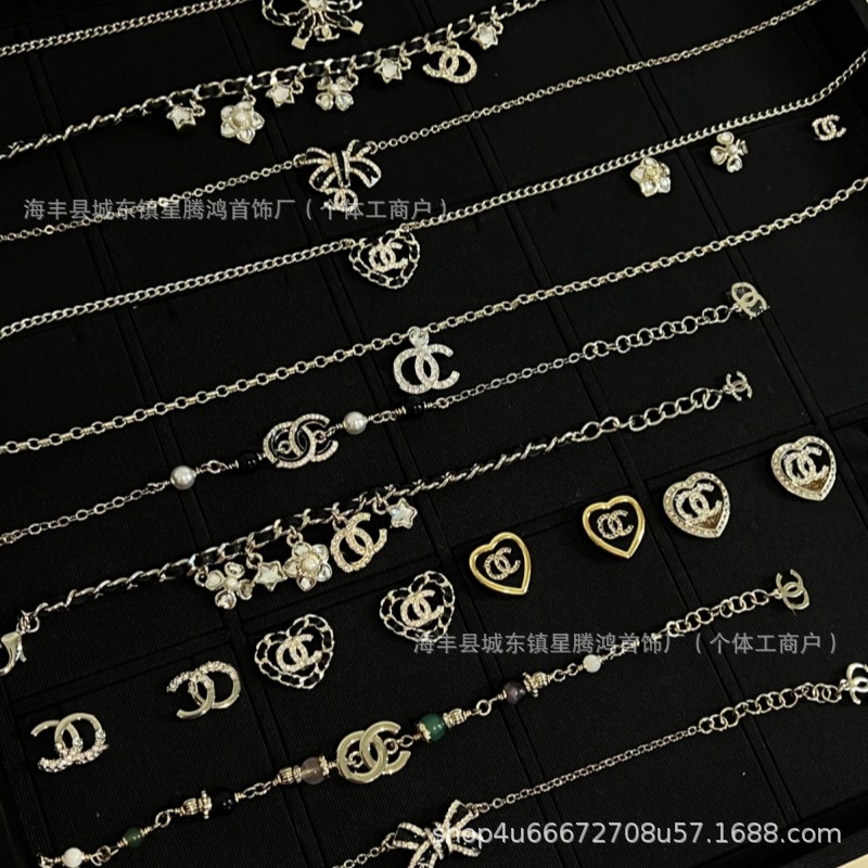 25B Chanel Double C Pearl Bowknot Heart Necklace Set for Women Fashionable High-End Chanel Style Leather Clavicle Chain