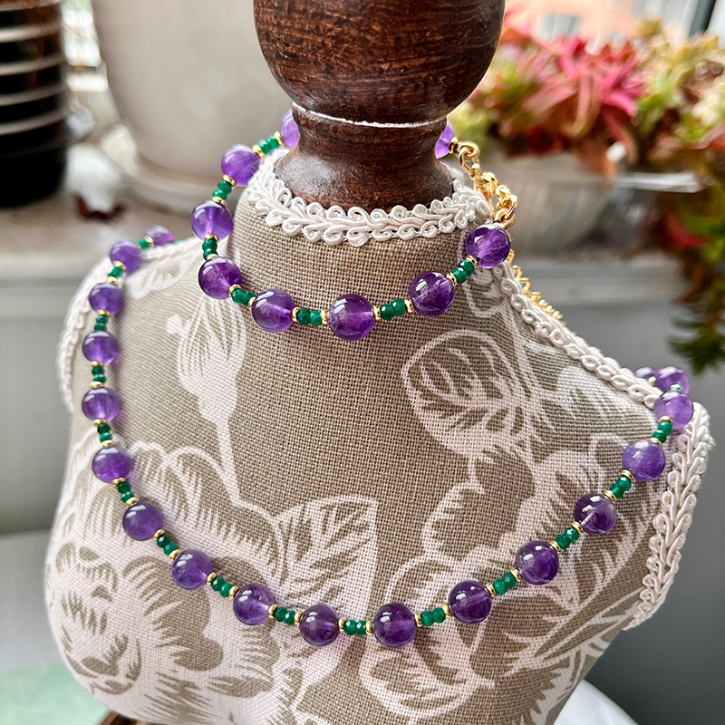 Vintage Amethyst Necklace with Multi-faceted Green Natural Stone Copper Plated Gold Spacers Fashion Elegant Qingdao Foreign Trade