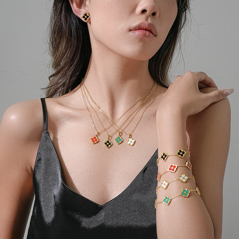 Light Luxury Geometric Small Square Flower Four-Leaf Clover Titanium Steel Necklace Girls High-End Fashion Popular Clavicle Chain Set