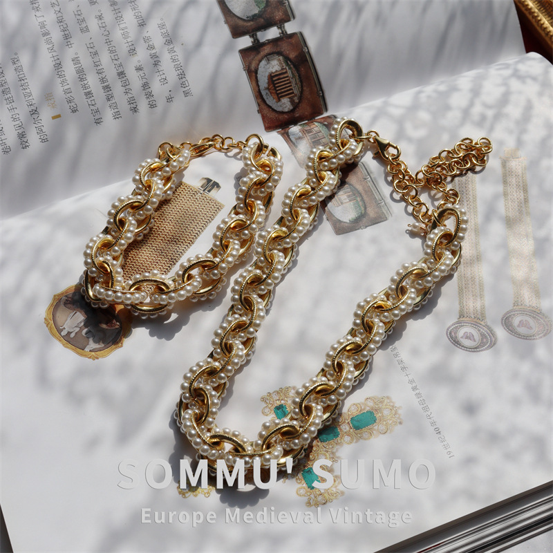 Vintage Second-Hand Necklace and Earring Set, Replica Pearl Short Bracelet, Copper Plated with Real Gold, Vintage Style