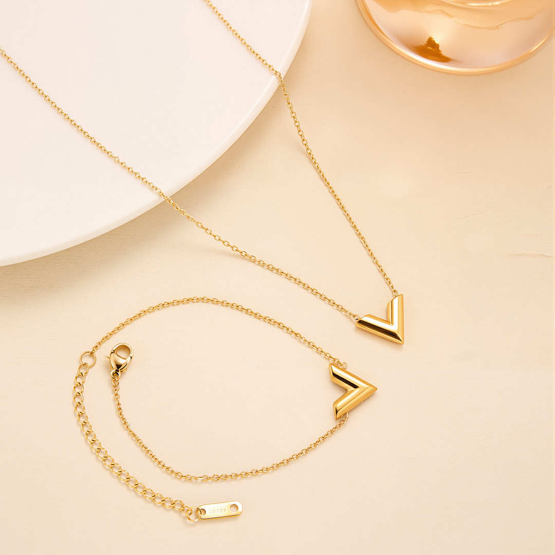 Rong Xun new all-body titanium steel fashion V necklace women's simple Joker letter bracelet clavicle chain suit wholesale