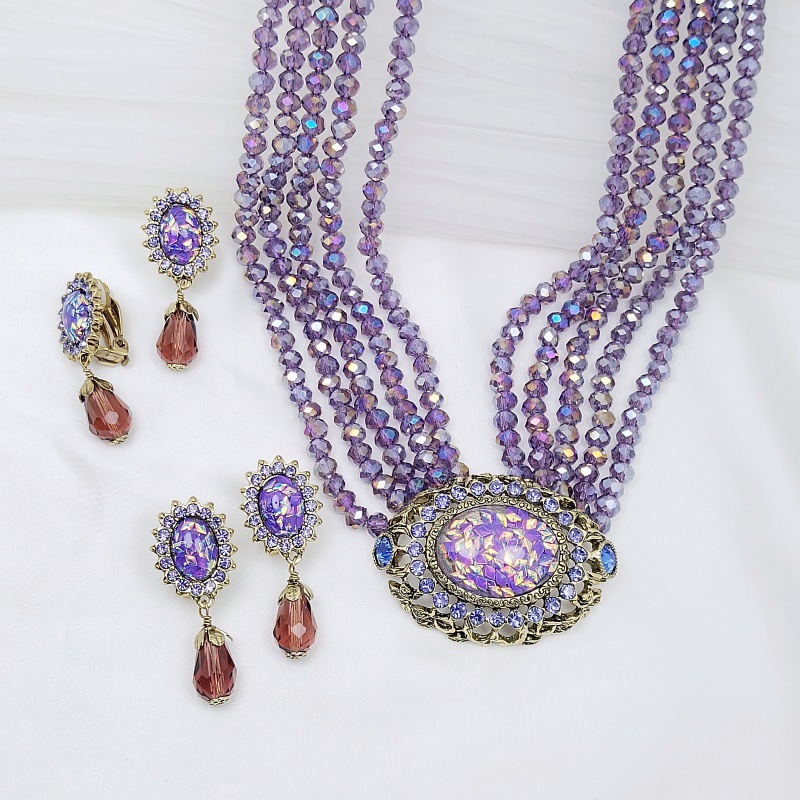 European and American Retro Style Versatile Colorful Full Diamond Purple Healing Pendant Fashion Earrings Necklace 2024 New Model