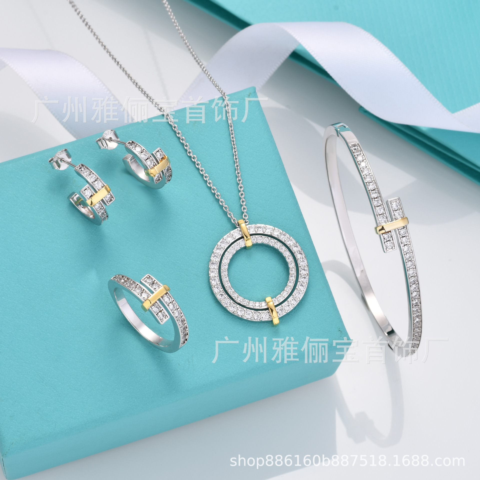 High version T home ring necklace female white copper plated 18K color separation gold diamond-embedded ring full diamond bracelet ear studs