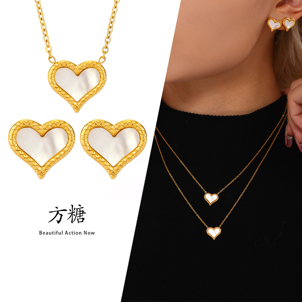 Sugar Cube French Natural Mother-Of-Pearl Heart Necklace Earrings Titanium Steel Plated 18K Real Gold Niche Exquisite Jewelry Set for Women