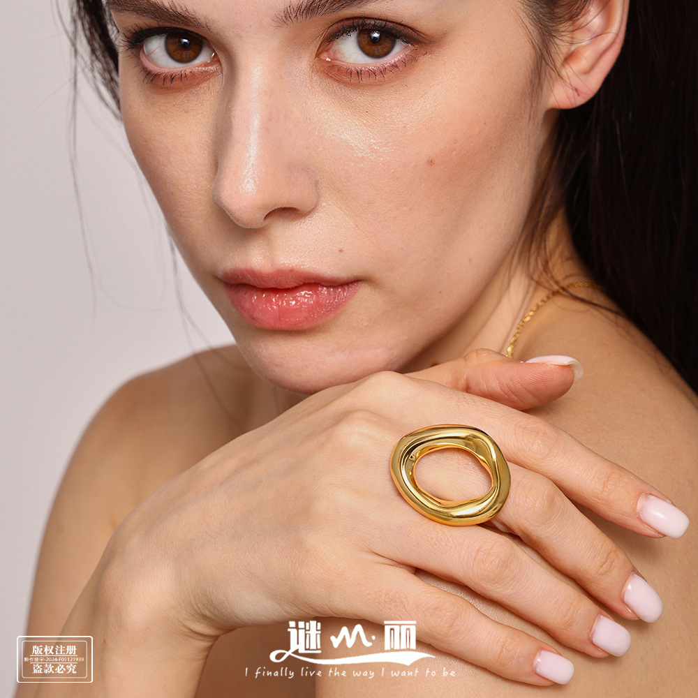 Exaggerated Open Hollow Ring Ins Square Letter Clavicle Necklace Stainless Steel Plated 18K Real Gold Set Trend