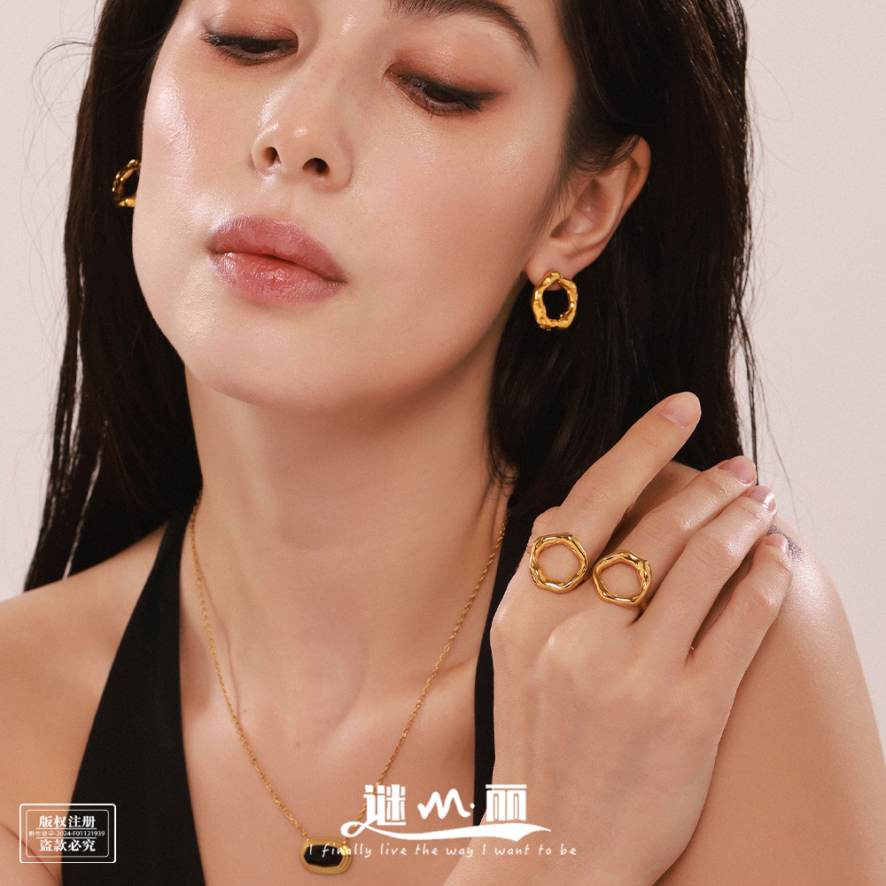 Mili Niche Circular Karst Ring Earrings European and American Fashion Simple Jewelry Stainless Steel Plated 18K Real Gold Set
