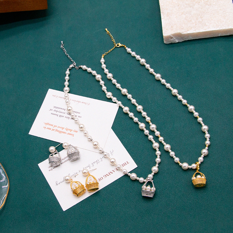 Flower Basket Glass Pearl Earrings Pendant Detachable Necklace Elegant Fashion Niche Creative Design Women's Gold and Silver Two Styles