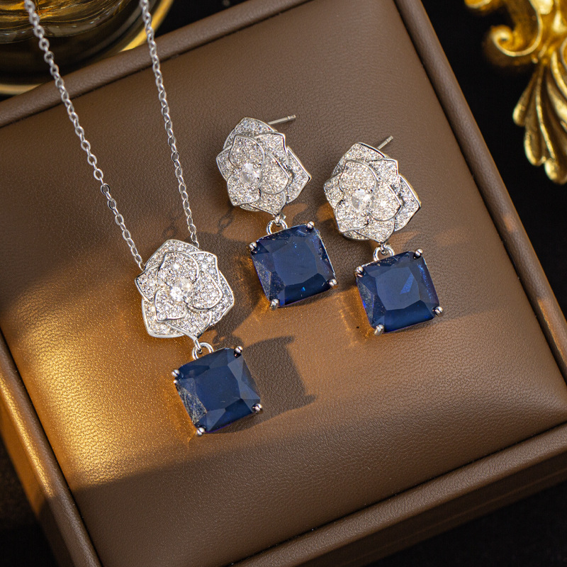 Cross-Border Popular Square Zirconium Flower Titanium Steel Necklace Women's Earrings Niche Design High-End Light Luxury Zirconium Set Jewelry