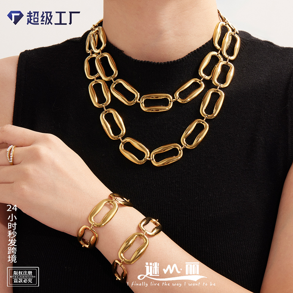Mili High-Polished Stainless Steel Rectangular Necklace Bracelet Jewelry Set Pvd Plated Real Gold European and American Cross-Border Exclusive Supply