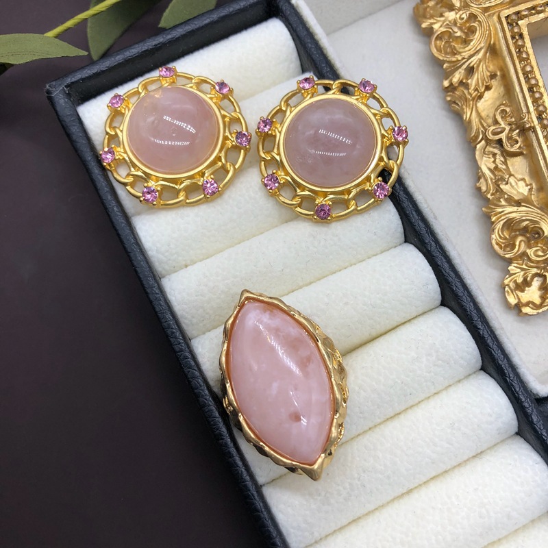 Natural pink crystal gold-plated elegant diamond-embedded round ear studs ear clip horse eye ring non-adjustable ring suit