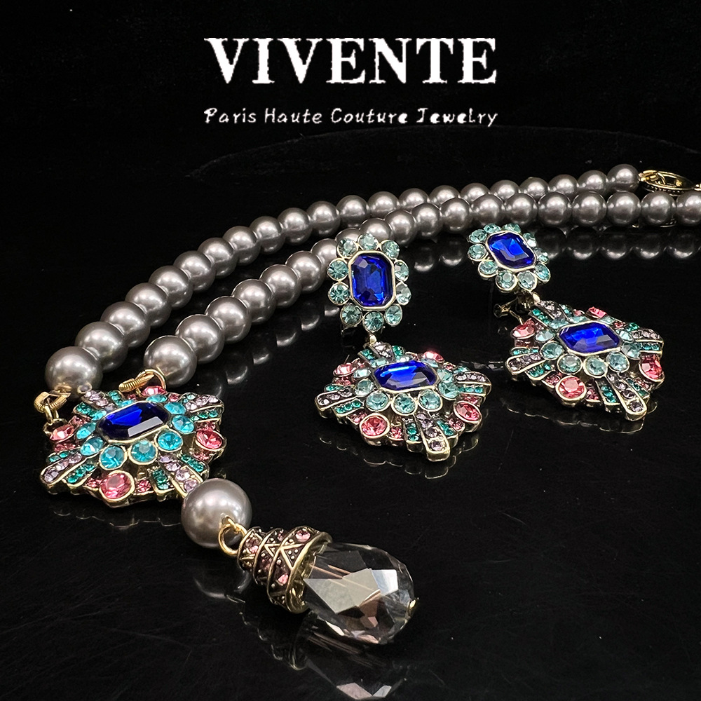Mid-ancient Vintage electroplated real gold elegant all-match round three-dimensional high-grade black sapphire blue necklace suit