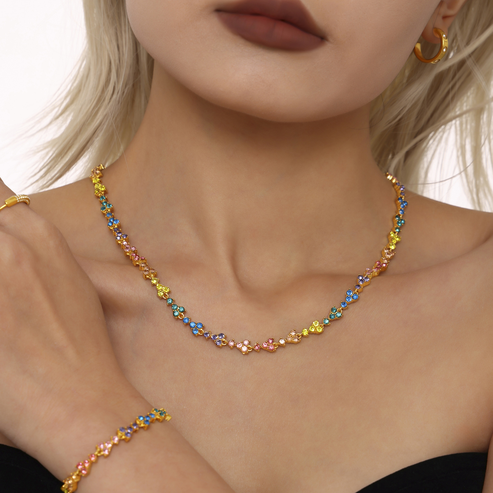 Enigma colorful dopamine handmade inlaid zircon clavicle necklace exquisite bracelet stainless steel 18K gold suit