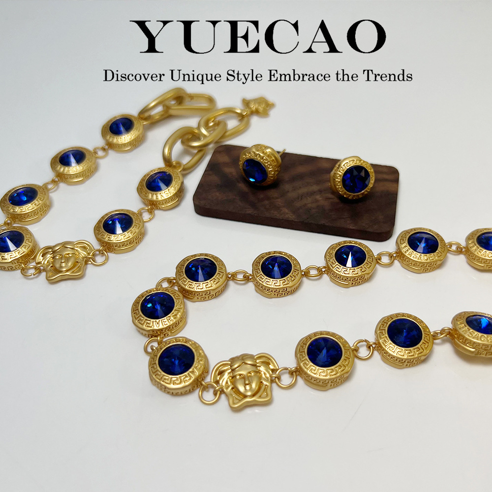 copper gold-plated sapphire suit Cuban clavicle chain cross-border retro cool style marking stud earrings bracelet