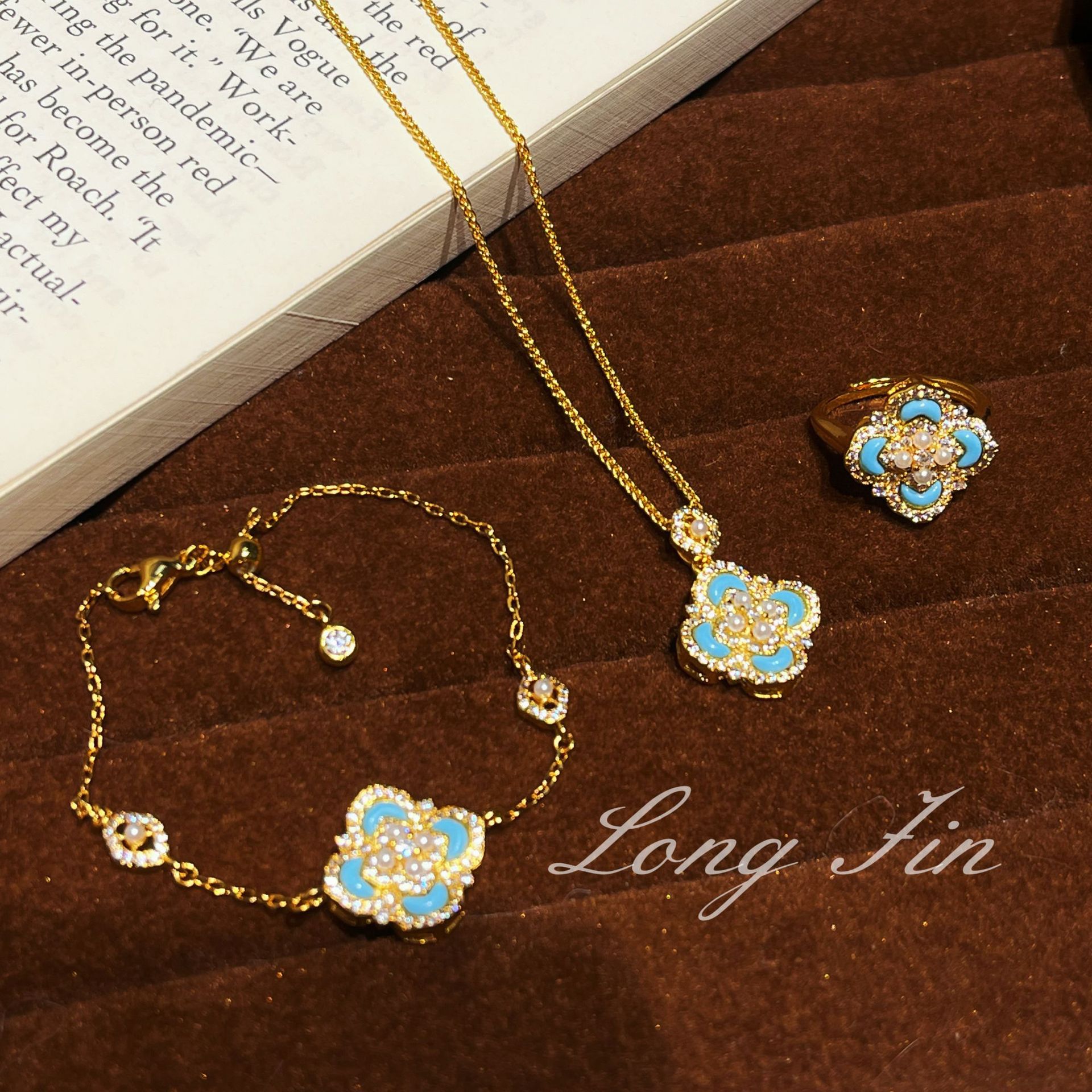 Light Luxury Retro Palace Style Blue Turquoise Imitation Pearl Four-Leaf Clover Necklace Bracelet Ring Light Luxury High-End Set