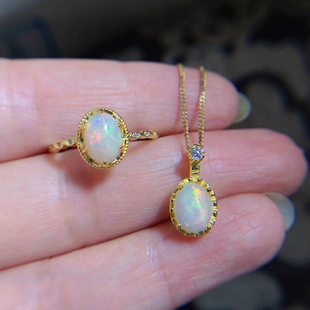 Natural White Opal suit Fire Color Good Color Super Good 925 Silver Inlay Two-piece Ring Necklace Women