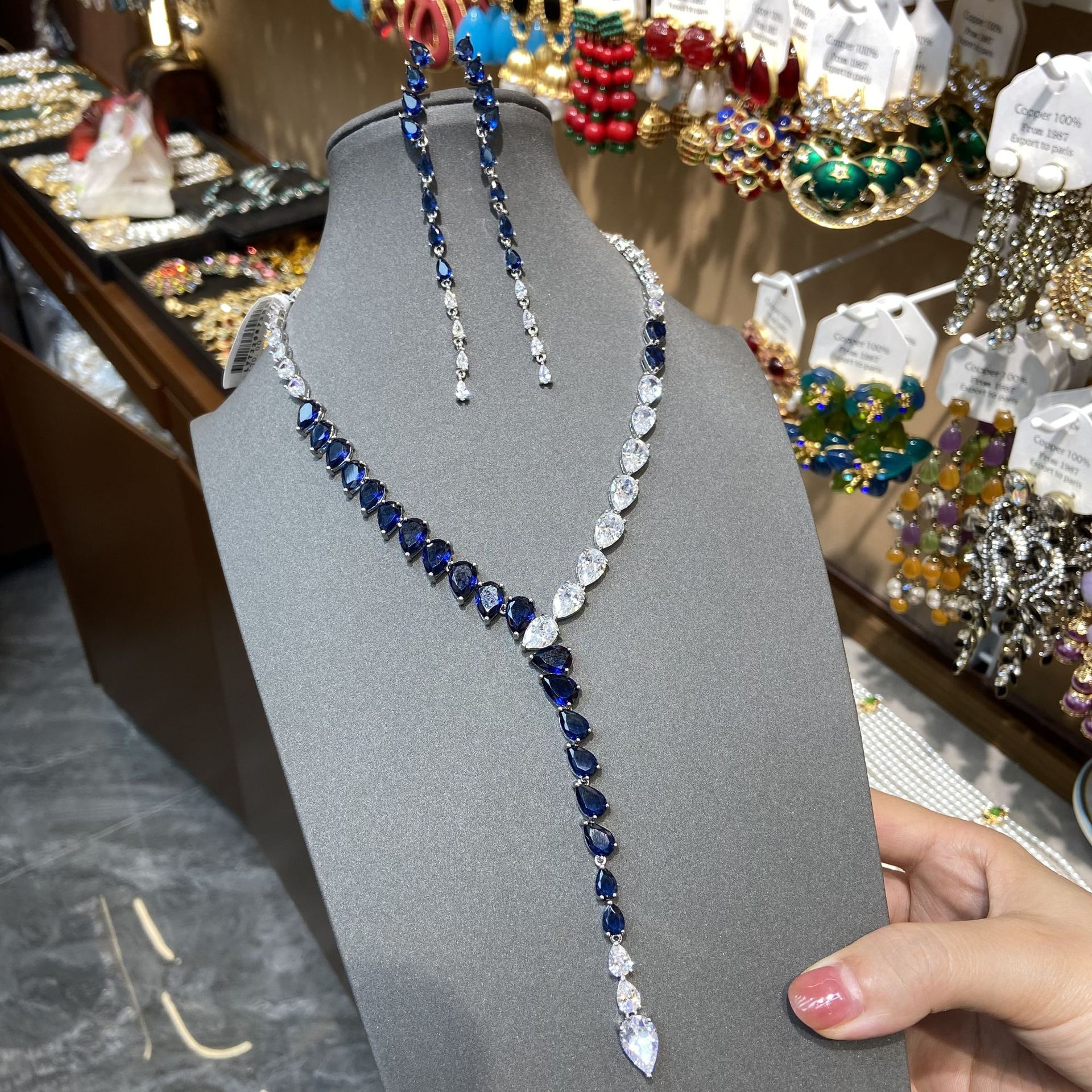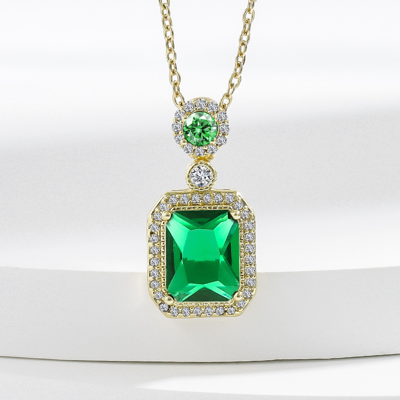 Silver Needle Zircon Emerald Artificial Crystal Earrings Necklace suit Retro High-grade Earrings Light Luxury Clavicle Chain for Women