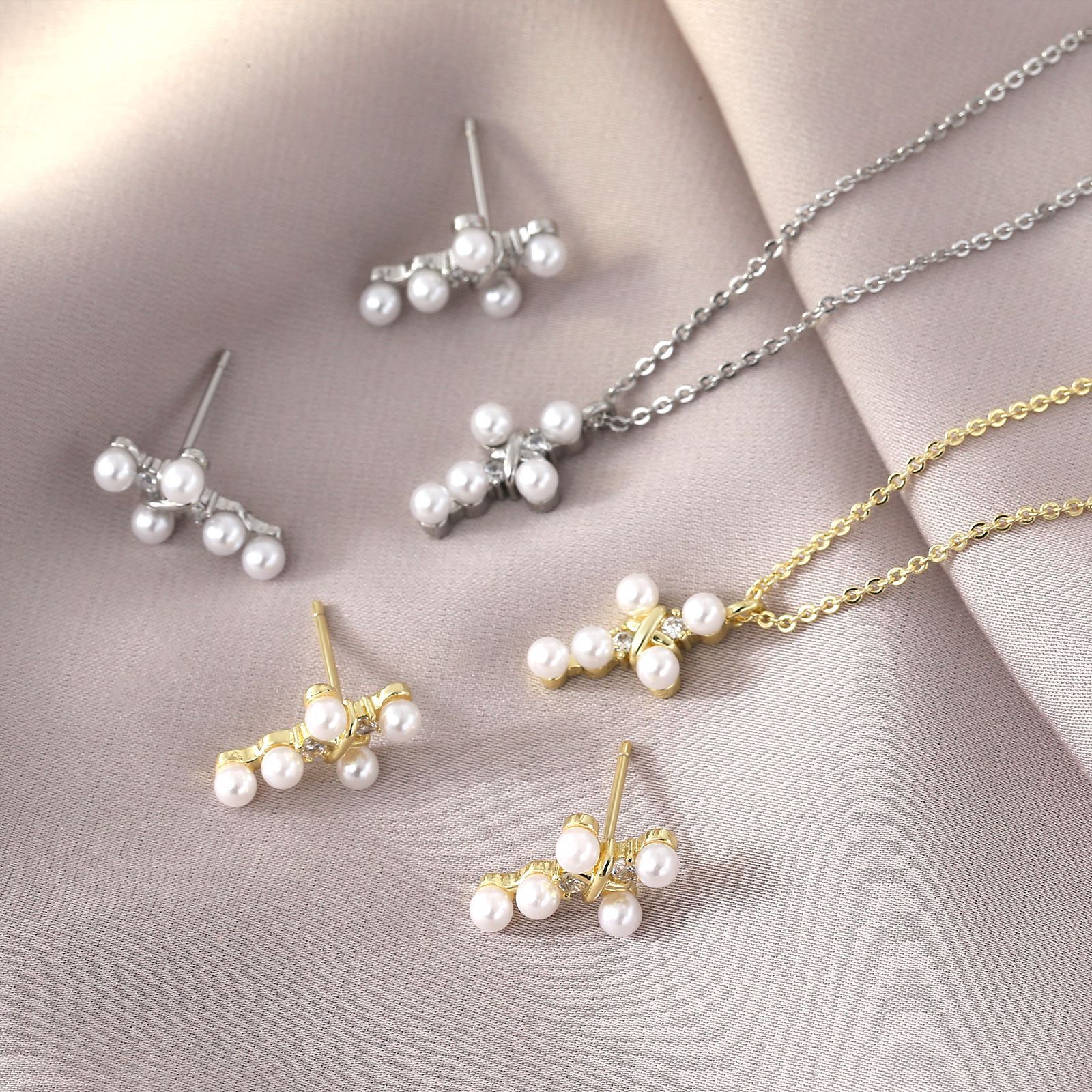 Cross-border Fashion French Style Pearl Cross Necklace suit Women's High-end Light Luxury Clavicle Chain Design Ear Stud