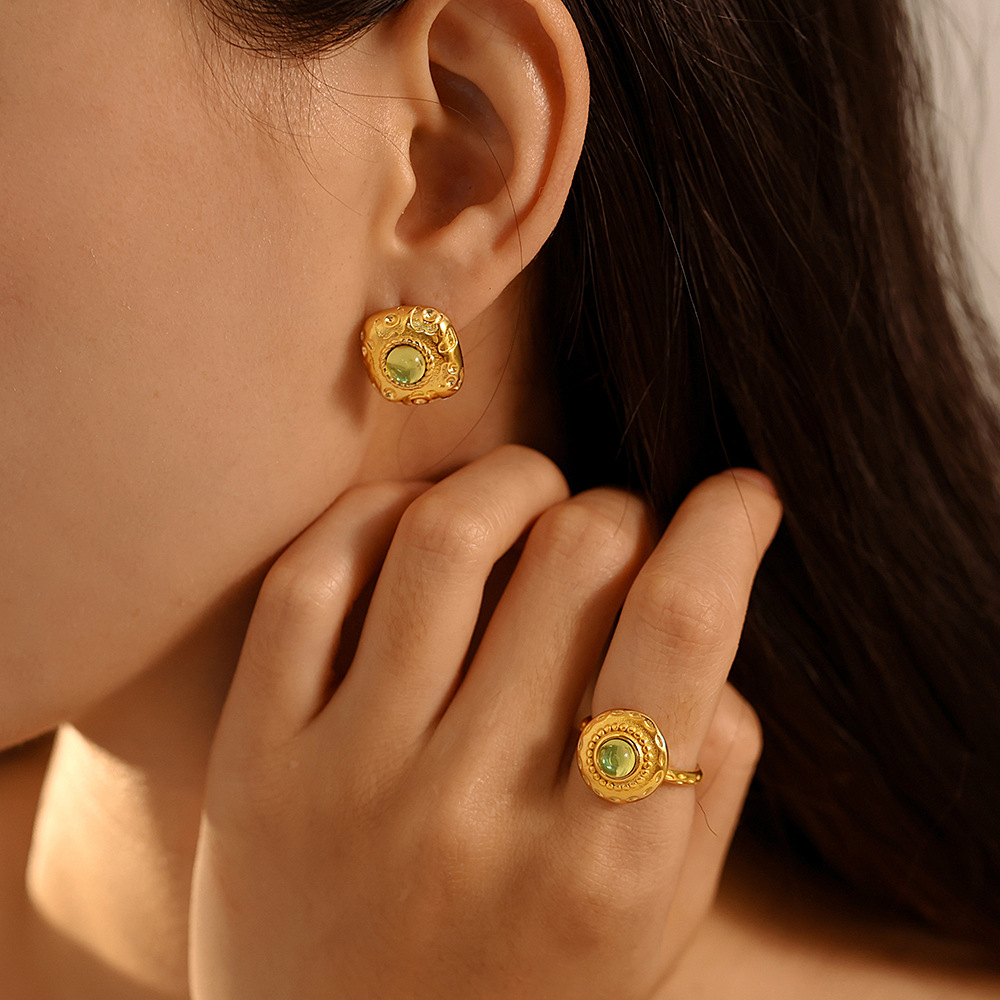 French Retro Square Thread Green Glass Earrings Court Style Opening Ring suit Titanium Steel PVD Plated 18K True Gold