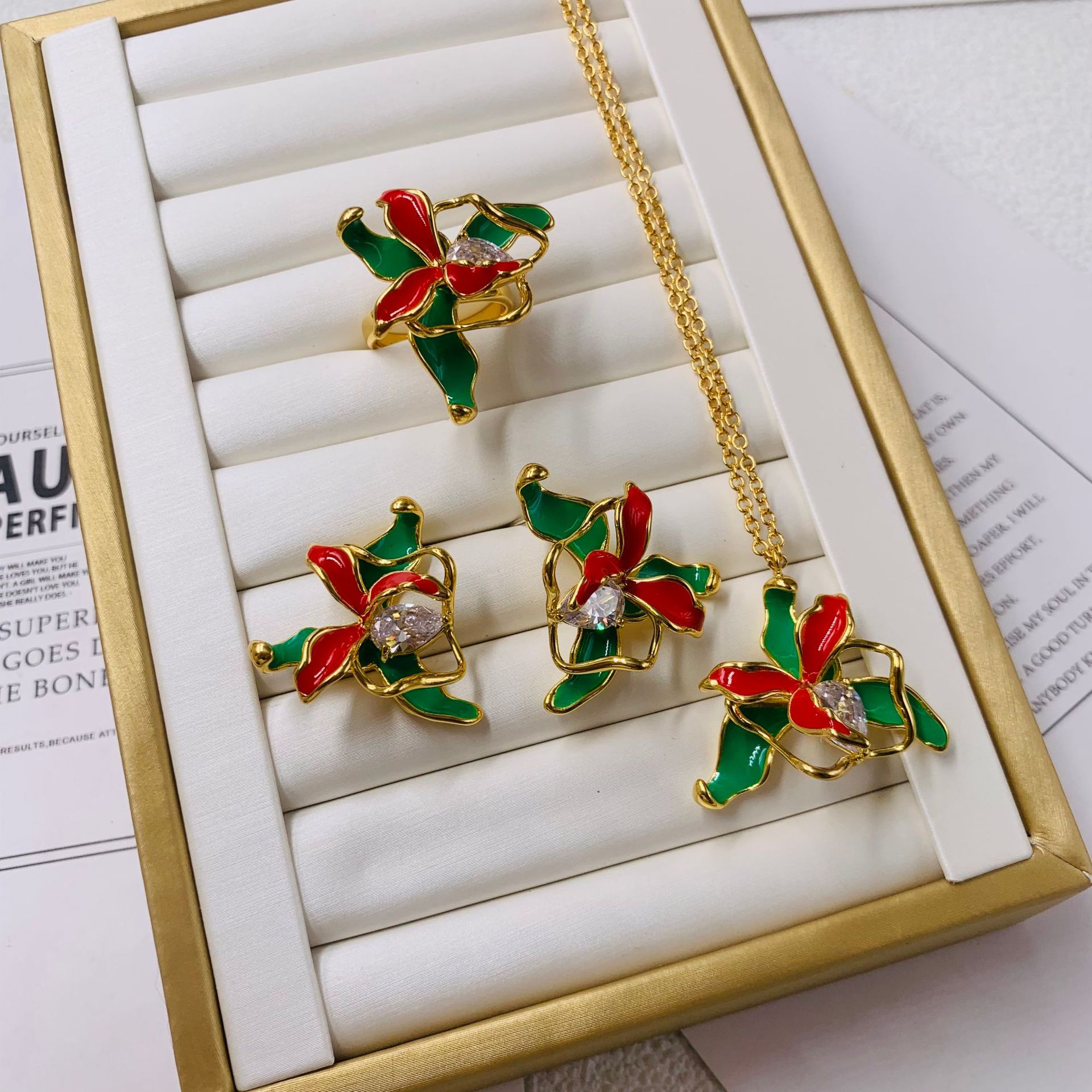 Mili Stainless Steel Plated 18K Real Gold Christmas Fashion Accessible Luxury Enamel Glaze Zircon Necklace Earrings Set
