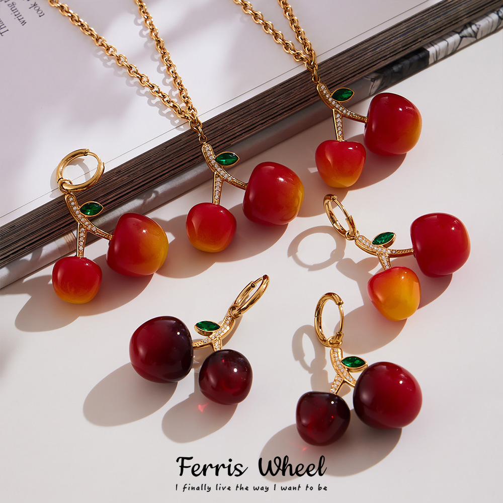 Ferris Wheel Resin Cherry Zircon Stainless Steel Gold-Plated Pendant Necklace Earrings Women's Light Luxury Fashion Temperament Set
