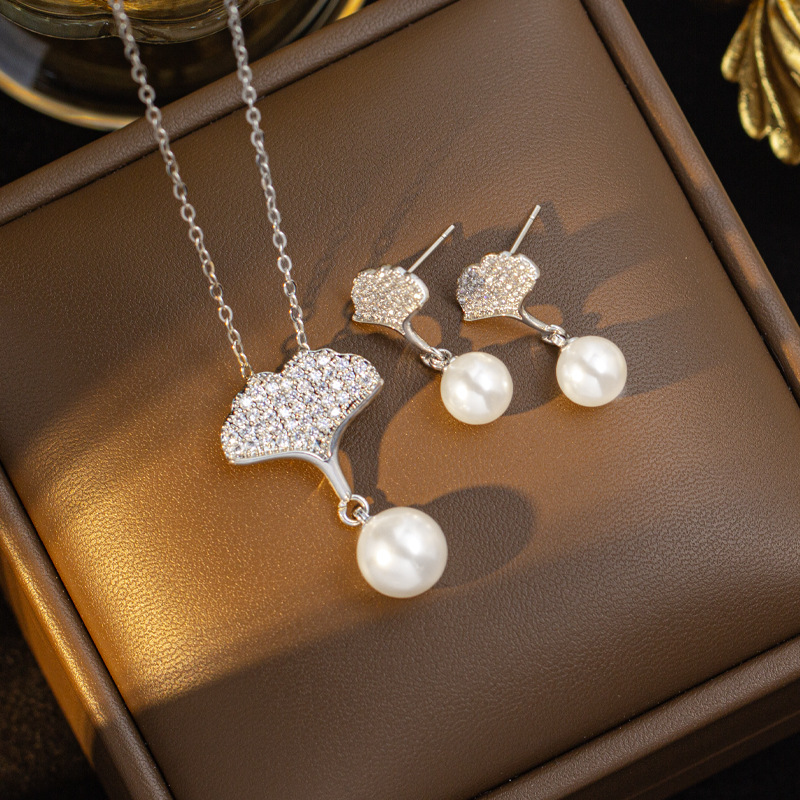 [Titanium Steel] Cross-Border Ginkgo Leaf Zircon Pendant Real Gold High-End Necklace Fashion Niche Earrings Jewelry Set