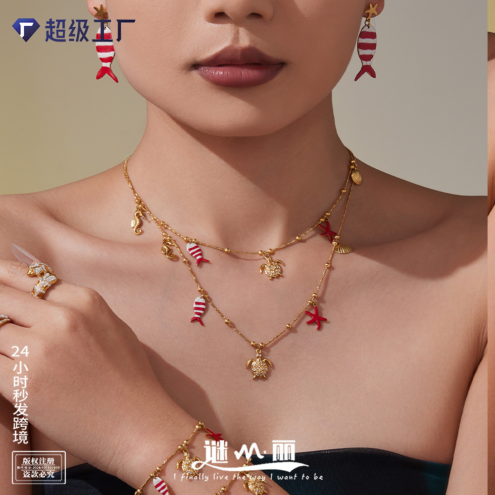 Xinyixinxin Stainless Steel Chain Pearl Dripping Oil Fish Multi-Color Pendant Necklace Earrings Set Plated with 18K Real Gold