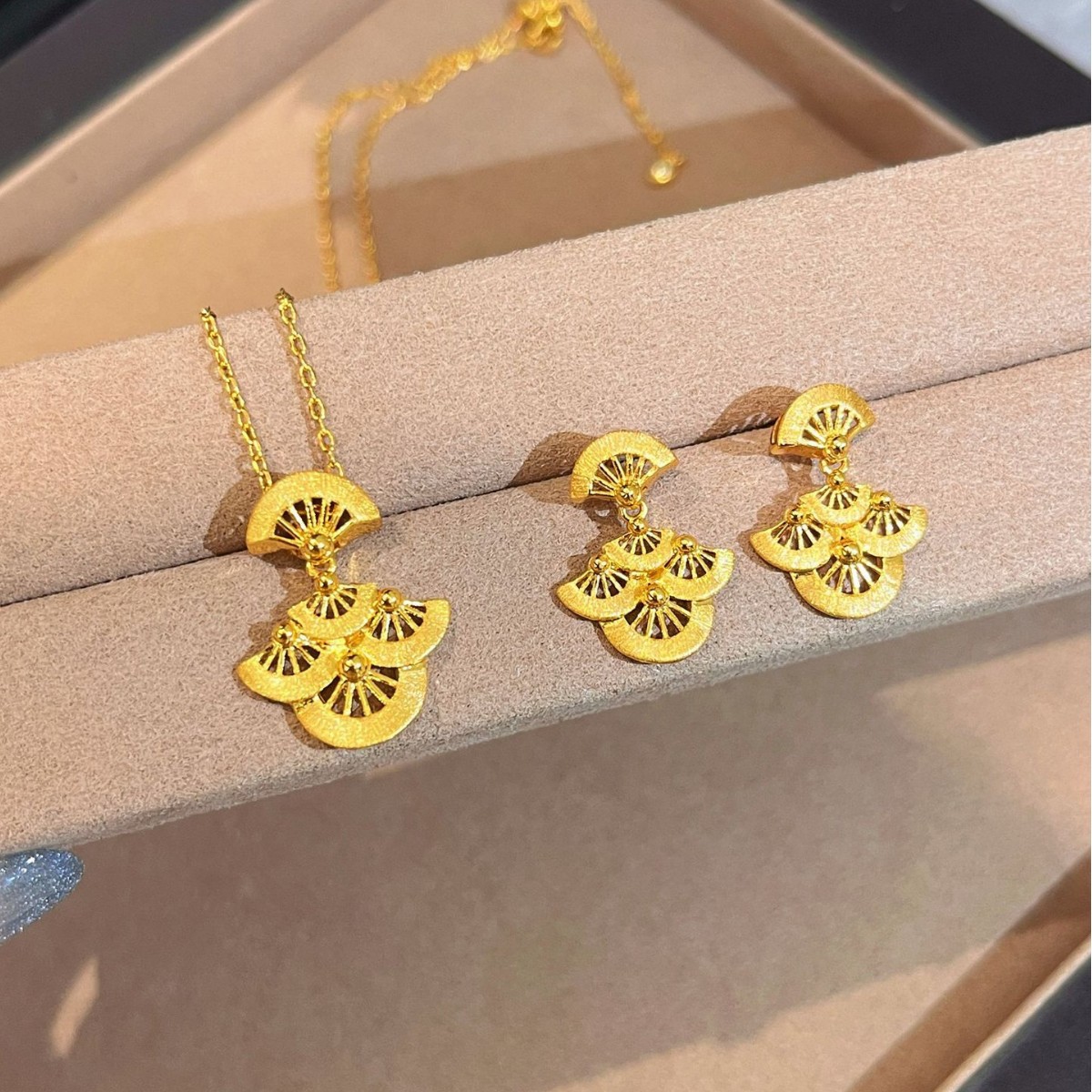 New Chinese Style National Style Brushed Velvet Ginkgo Leaf Fan Necklace Earrings High-End Light Luxury Fan-Shaped Pendant Set