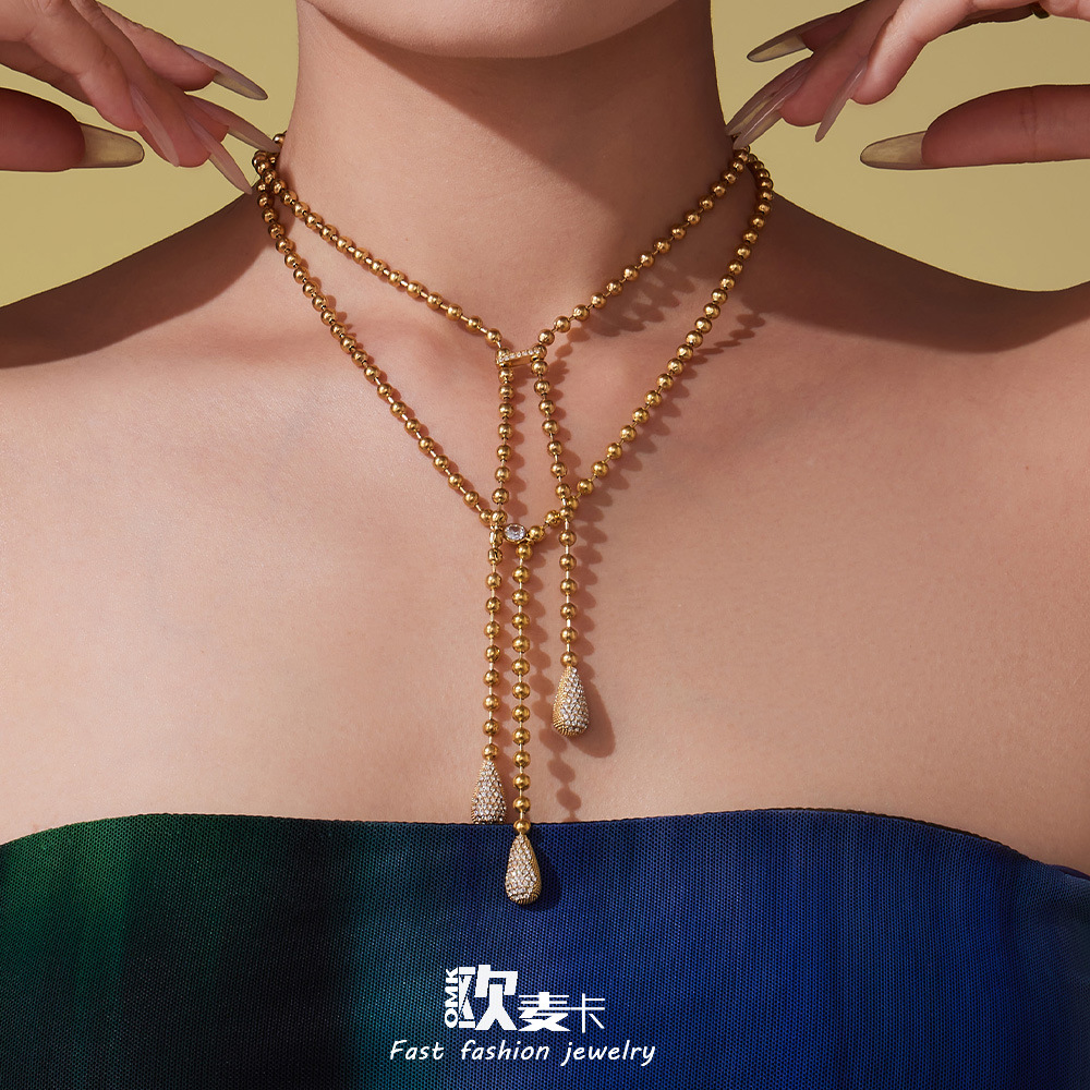 Omaca Cross-Border New Stainless Steel Rice Bead Chain Water Drop Zircon Pendant Necklace Earrings Set Plated with 18K Real Gold