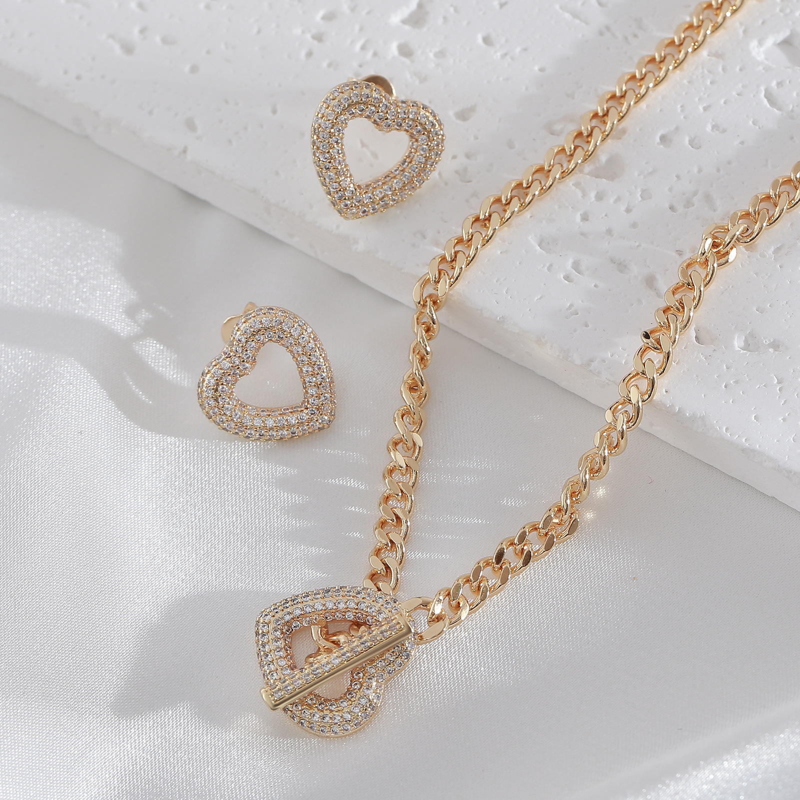 Copper Plated with 18K Gold, Fashionable Heart-Shaped Zircon Pendant Necklace, Latest Cross-Border Wholesale Women's Necklace Set