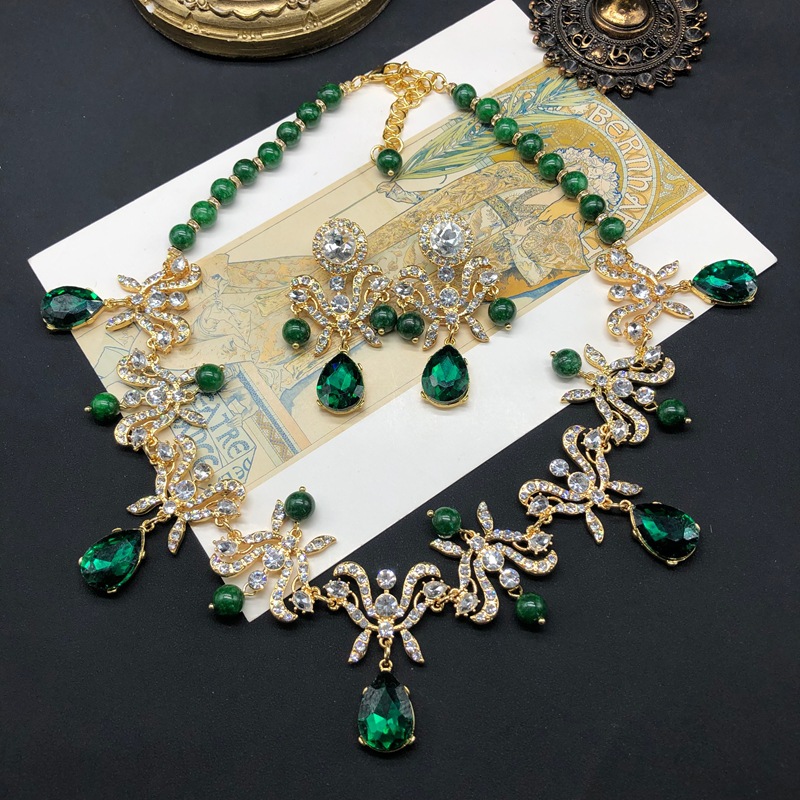 Medieval Style Design Jewelry, Real Gold-Plated Emerald Necklace and Earrings, Versatile Set, Elegant Jewelry
