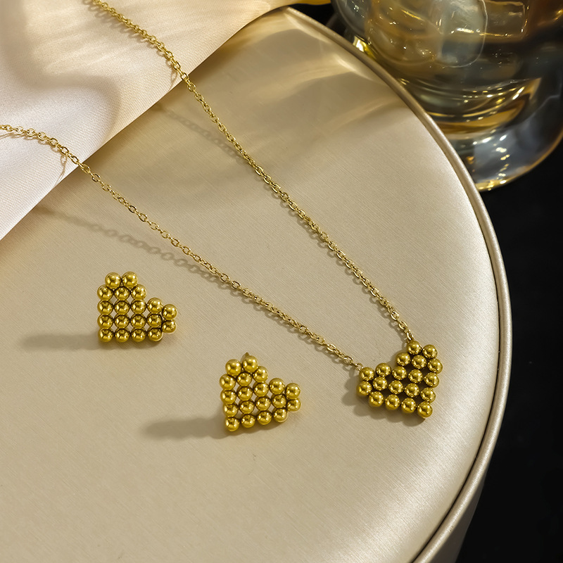 Korean style personality fashion niche popular to create titanium steel gold-plated peach heart steel ball necklace earrings jewelry suit wholesale
