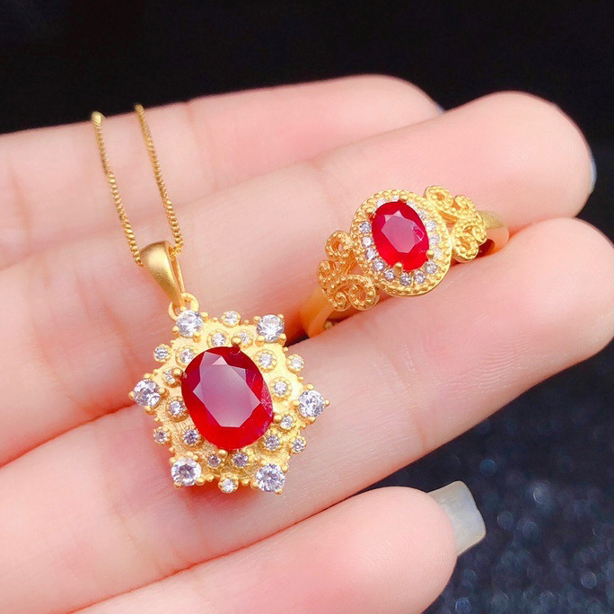 New gold-plated ring inlaid simulation ruby ring female live pendant necklace set live hot sale