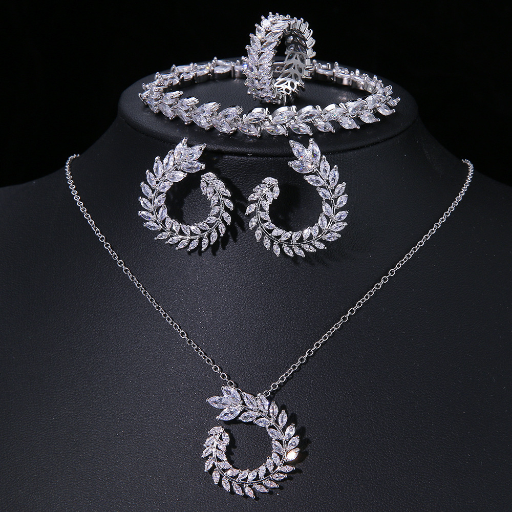 Cross-border Korean style leaves bridal wedding suit accessories high-grade zircon necklace earrings ring bracelet four pieces suit