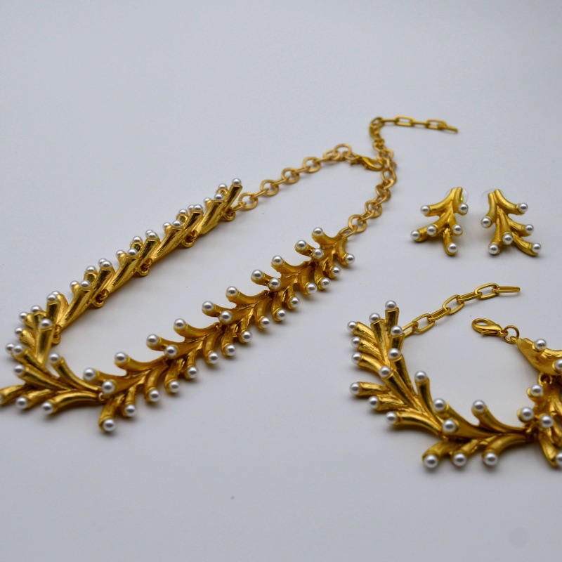 Vintage Palace-Style Gold-Plated Leaf Pearl Flower 925 Silver Monet Earrings and Necklace Set for Women Pendant