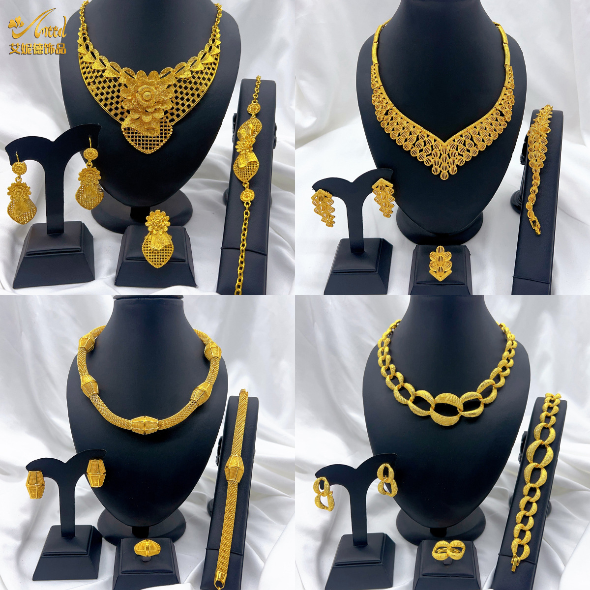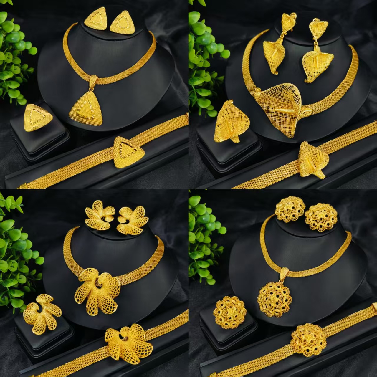 24K Gold Plated Necklace Earrings Ring Bracelet Set Middle East Dubai India Nigeria Bridal Jewelry Ready Stock
