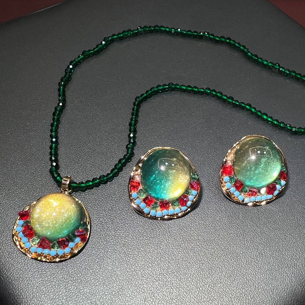 Middle Aged Shell Glaze Jewelry suit Internet Celebrity Explosions Green Crystal S925 Gold Plated Colorful Glaze Earrings