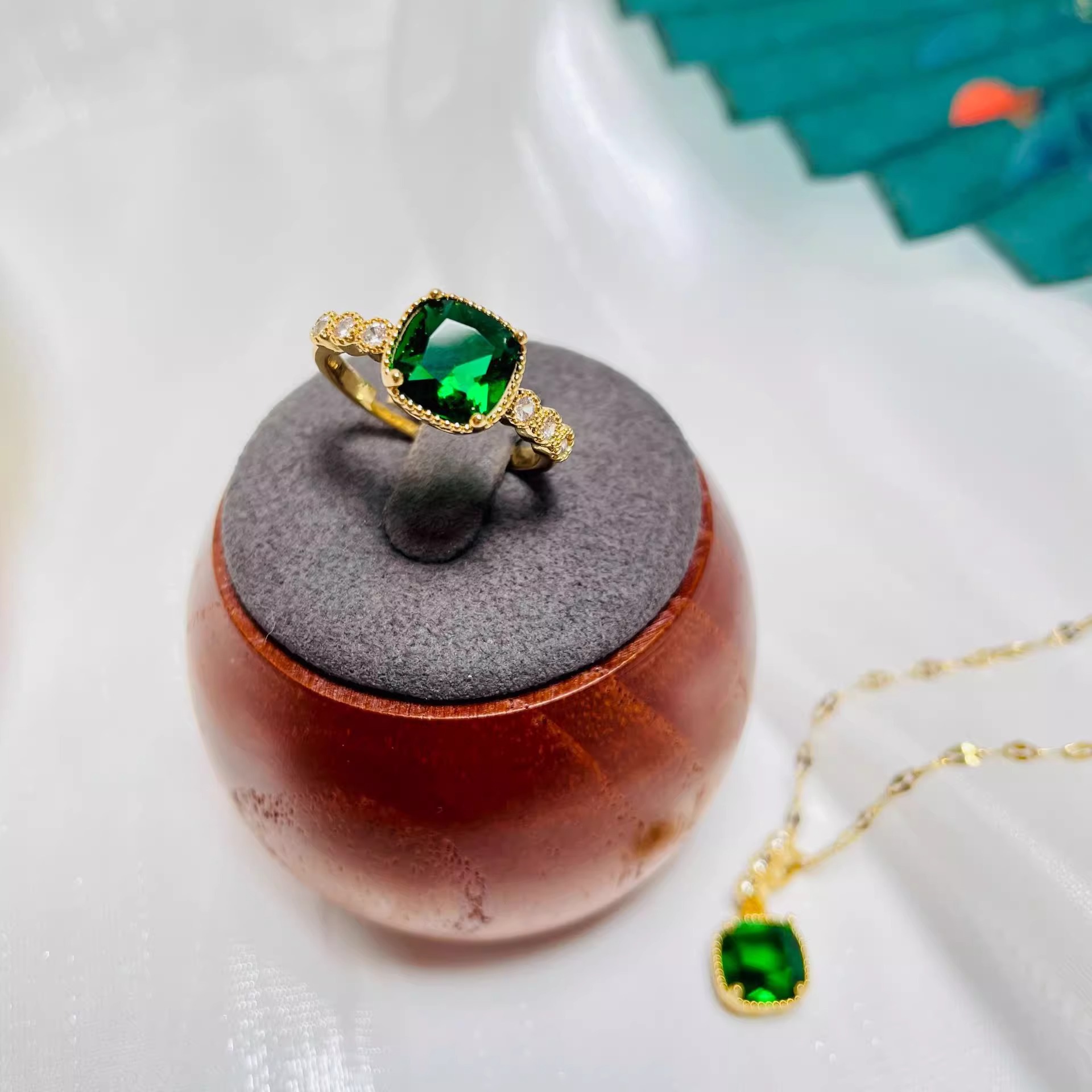 Small Zircon Emerald Crystal Ear Button Necklace suit Women's Internet Celebrity Elegant 2024 New Fashionable Light Luxury Vintage