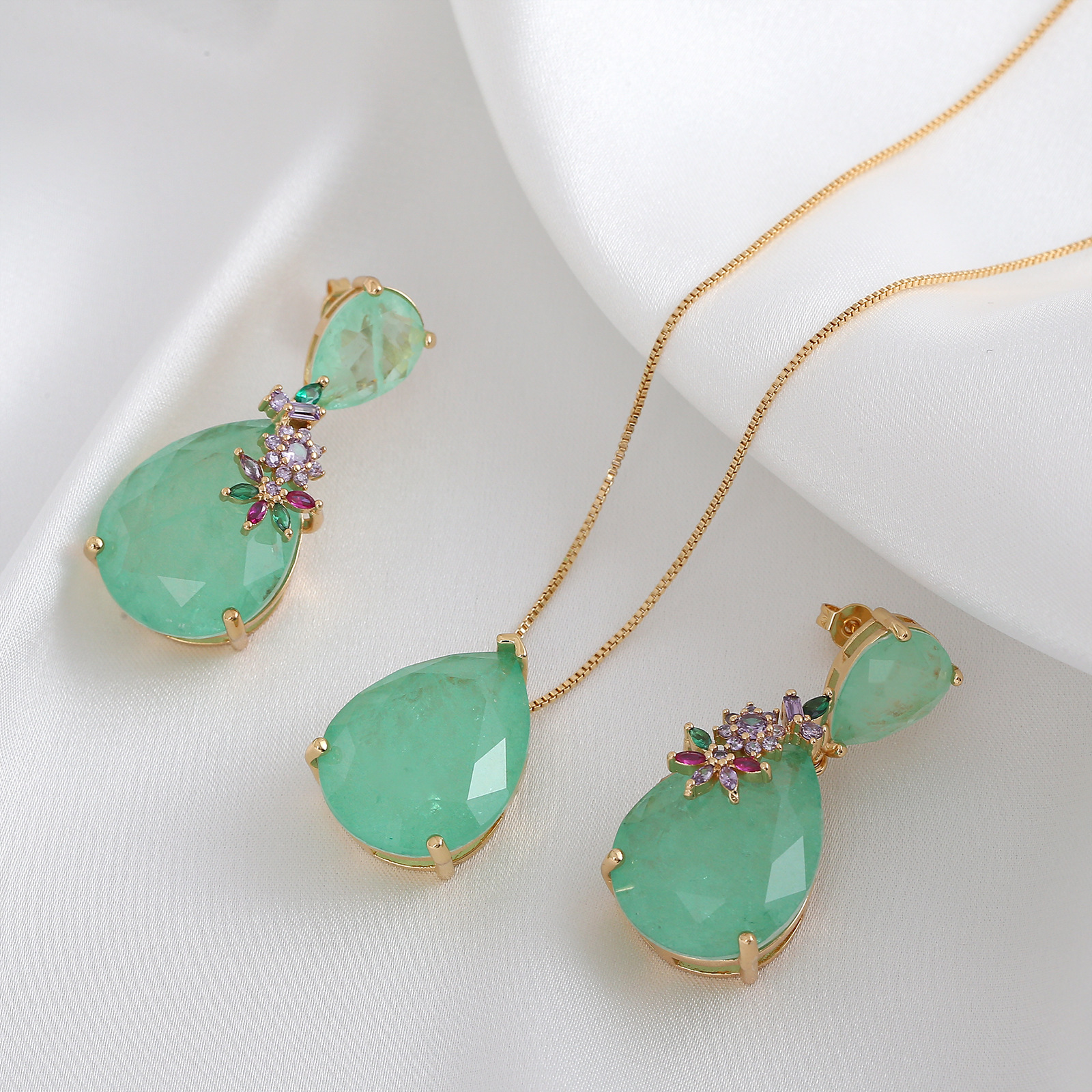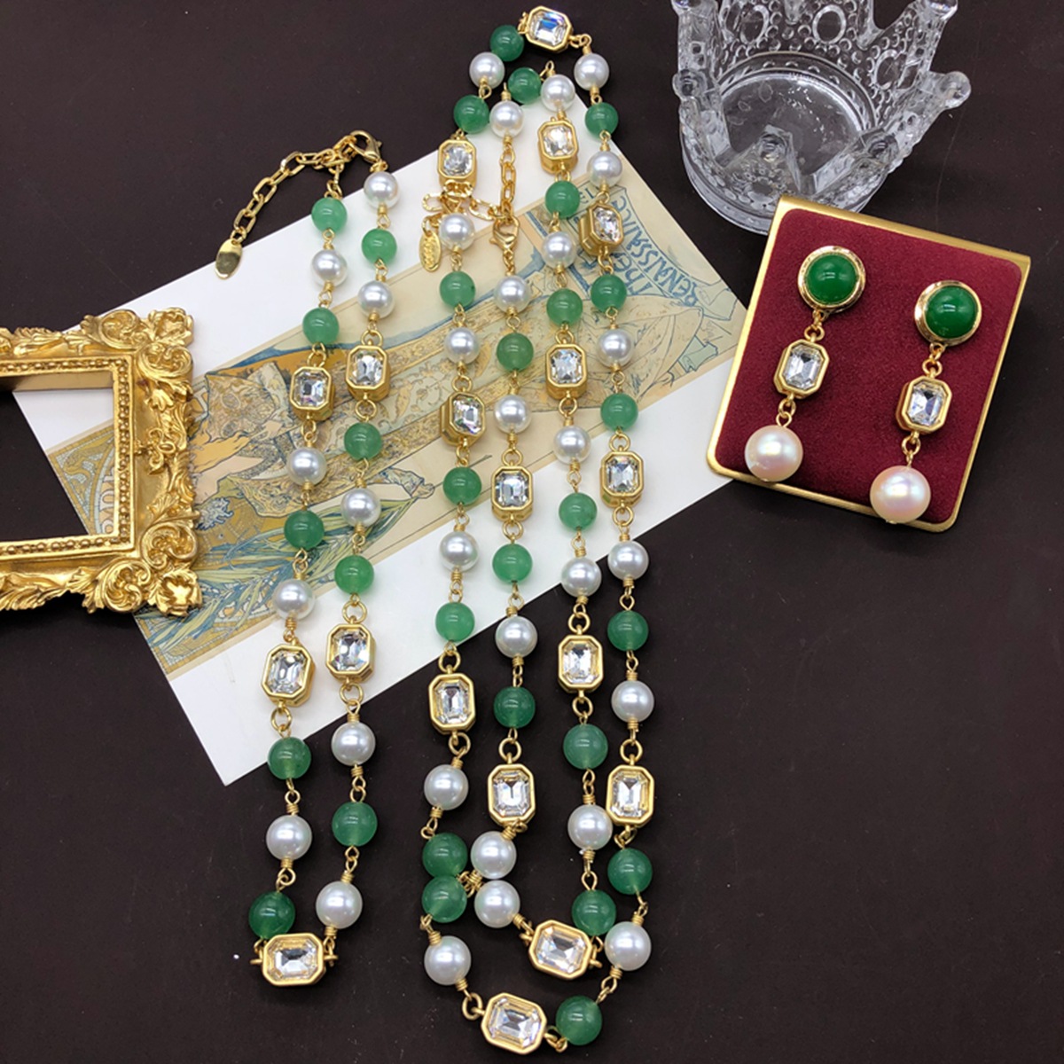 Cross-border real gold-plated long short green glaze pearl necklace earrings cut face gemstone sweater chain earrings set