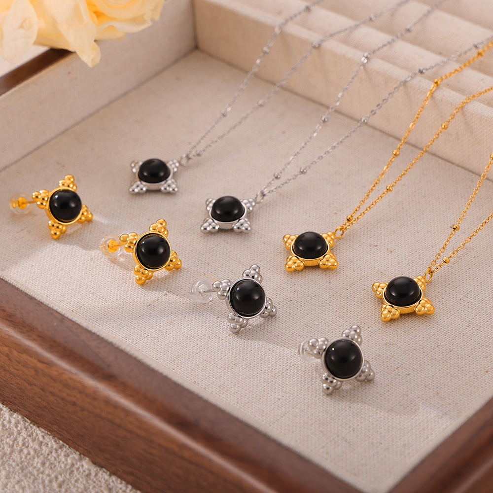French Style Simple Daily Black Onyx Pendant Women's Antique New Product Titanium Steel Gold-plated Necklace Niche Design Jewelry suit